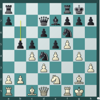 Het was nodig om 13…h7-h6 te spelen, waarna de computer de stelling beoordeeld als gelijk. Na 13…b5 14.g5 staat wit beter, want na 14…Pe8 staat zwart veel te passief, en na 14…Ph5 (zoals in de partij) gaat materiaal verloren.